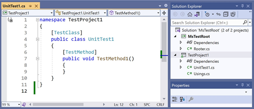 The above code is autogenerated. A class with one method has been added to the project. The class has been decorated with the [TestClass] attribute telling MsTest that it contains unit test code. Every unit test method in the test class must be decorated with the [TestMethod] attribute.